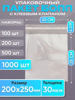 Упаковочные БОПП пакеты с клеевым клапаном 20х25 см, 1000 шт