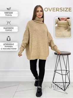 Свитер оверсайз песочный вязаный, туника с горлом