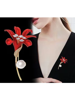 Брошь цветок красный с жемчугом