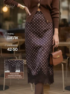 атласная юбка шелковая миди горох с кружевом