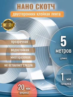 Двусторонний скотч 5 метров, ширина 20мм прозрачнный