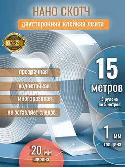 Двусторонний скотч крепкий 15 метров, ширина 2см, 1мм