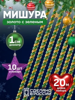 Мишура новогодняя зеленая с золотым тонкая, 10 штук