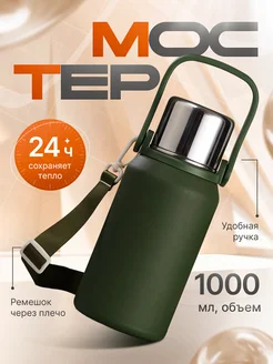 Термос 1 литр для чая металлический с кнопкой и чашкой