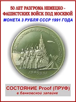 Монета 3 рубля СССР 1991, 50 лет победы под Москвой, Proof