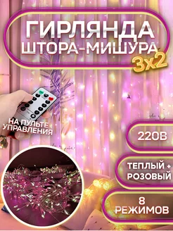 Гирлянда штора мишура 3х2 600 LED теплая+розовая