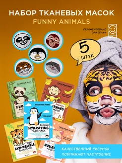 Маски для лица тканевые детские с животными набор 5 штук