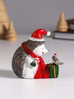 Фигурка Ёжик в красном колпак и шарфе с подарком и птичкой