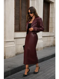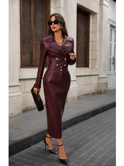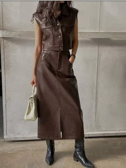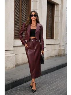 Стильный комплект из кожаной укороченной куртки с юбкой