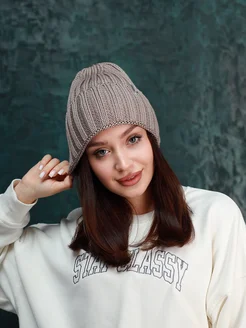 Шапка бини зимняя вязаная с отворотом