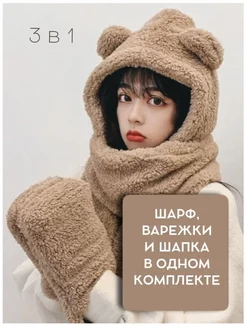 Шапка зимняя с шарфом и варежками 3в1 с ушками