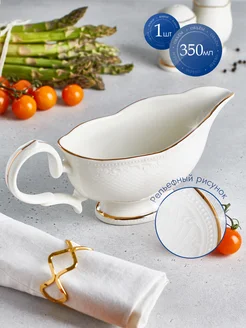 Фарфоровый соусник с ручкой с золотой каймой 350 мл, 1 шт