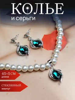 Колье и серьги из жемчуга с зелёным камнем