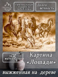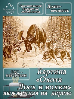 Картина выжженная на дереве Охота. Лось и волки 30х40см