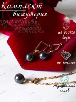 Комплект ожерелье с серьгами бижутерия черный жемчуг