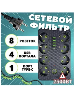 Удлинитель сетевой с 4 USB и Type-C 8 розеток Переноска