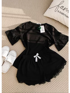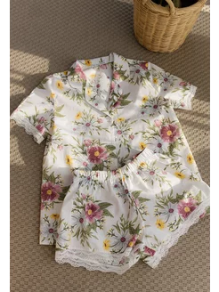 Пижама с шортами и футболкой хлопок кружевная