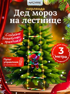 Дед мороз на лестнице светящийся на окно гирлянда 300 см