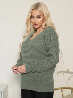 Кофта теплая вязаная в полоску оверсайз с вырезом