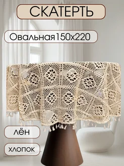 Скатерть тканевая овальная на стол кружево и лен 150*220 см