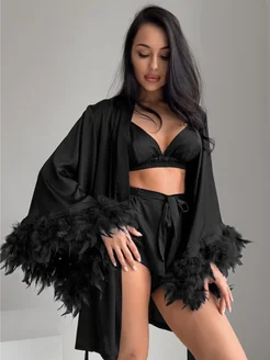 Атласная пижама с перьями и шортами
