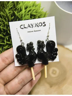 Серьги черные петушки на палочке, 3 см, ручная работа