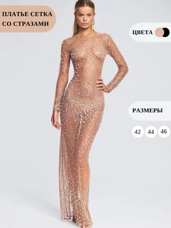 Вечернее обтягивающее бежевое платье в пол со стразами