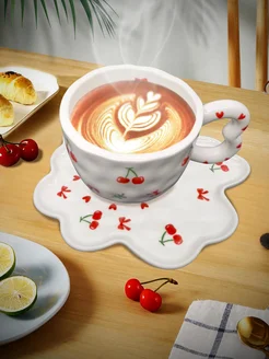 Кружка с вишневый, набор блюдце и чашка, ручной работы