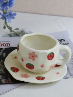 Кружка с клубникой, набор блюдце и чашка, ручной работы