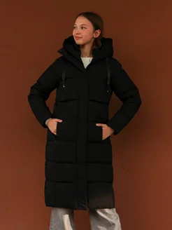 Куртка зимняя удлиненная с капюшоном из экокожи
