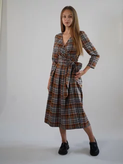Платье на запах нарядное с вырезом клетка
