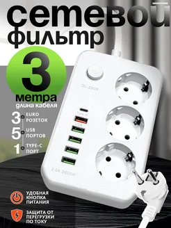 Сетевой фильтр 5 метров белый 3 розетки USB TYPE C