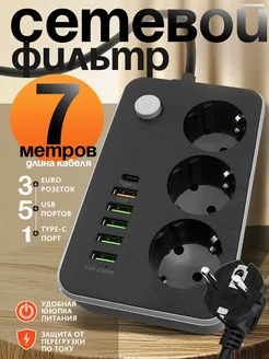 Сетевой фильтр 7 метров чёрный 3 розетки USB TYPE C