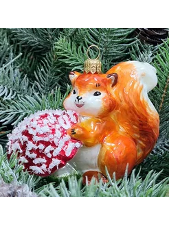 Елочная игрушка, стекло Белка с грибочком рыжая 10х7,5х5,5см