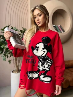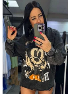 лонгслив худи свитшот оверсайз рваное с принтом Мики Моус