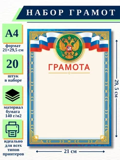 Грамота синяя с гербом и флагом РФ, А4, 20 шт НБГ 24.005