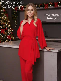 Пижама шелковая кимоно со штанами и рубашкой