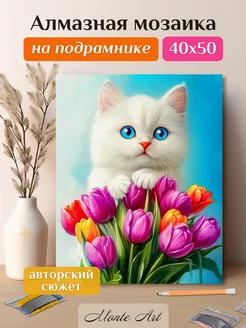 Алмазная мозаика на подрамнике 40х50 Котик с цветами портрет