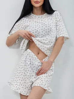 Пижама с шортами и футболкой оверсайз в цветочек хлопок