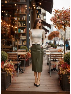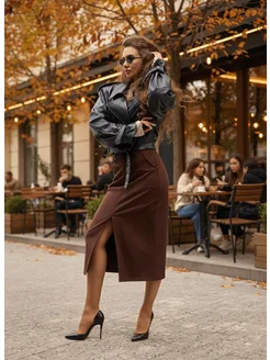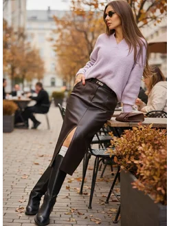 Юбка кожаная миди карандаш с разрезом спереди