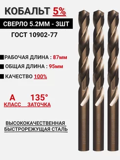 Сверло по металлу 5.2мм - 3шт Кобальт 5% Р6М5К5