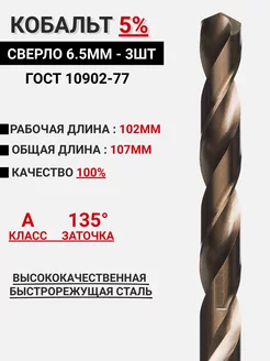 Сверло по металлу 6.5мм - 3шт Кобальт 5% Р6М5К5