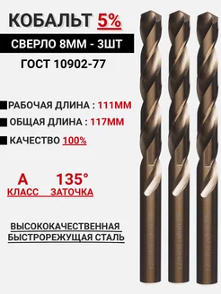 Сверло по металлу 8мм - 3шт Кобальт 5% Р6М5К5