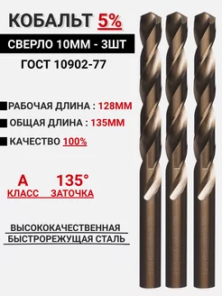 Сверло по металлу 10мм - 3шт Кобальт 5% Р6М5К5