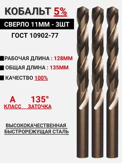 Сверло по металлу 11мм - 3шт Кобальт 5% Р6М5К5