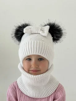 Детская зимняя шапка и снуд с помпоном на завязках