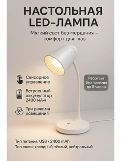 Настольная LED-лампа, регулировка яркости, 3 режима света
