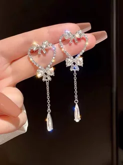 Серёжки серебристые сердце с подвеской - камни