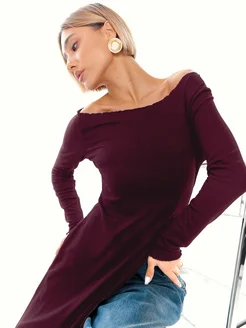 Бордовый лонгслив с открытыми плечами удлиненный