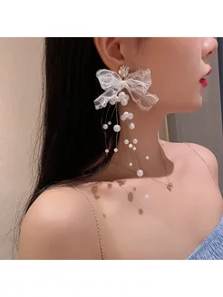 Серьги бантики крупные с жемчугом и камнями кружевные